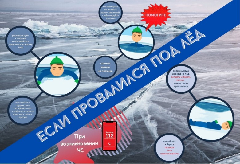 Если вы провалились под неокрепший лед, не паникуйте, а приложите все усилия для того, чтобы выбраться. Прежде всего, немедленно раскиньте руки, чтобы не погрузиться в воду с головой, и таким образом удерживайтесь на поверхности. Позовите на помощь. Не барахтайтесь в воде, хватаясь за кромку льда, это приведёт лишь к напрасной потере сил. Старайтесь лечь грудью на кромку льда, выбросив вперед руки, или повернуться на спину и закинуть руки назад.